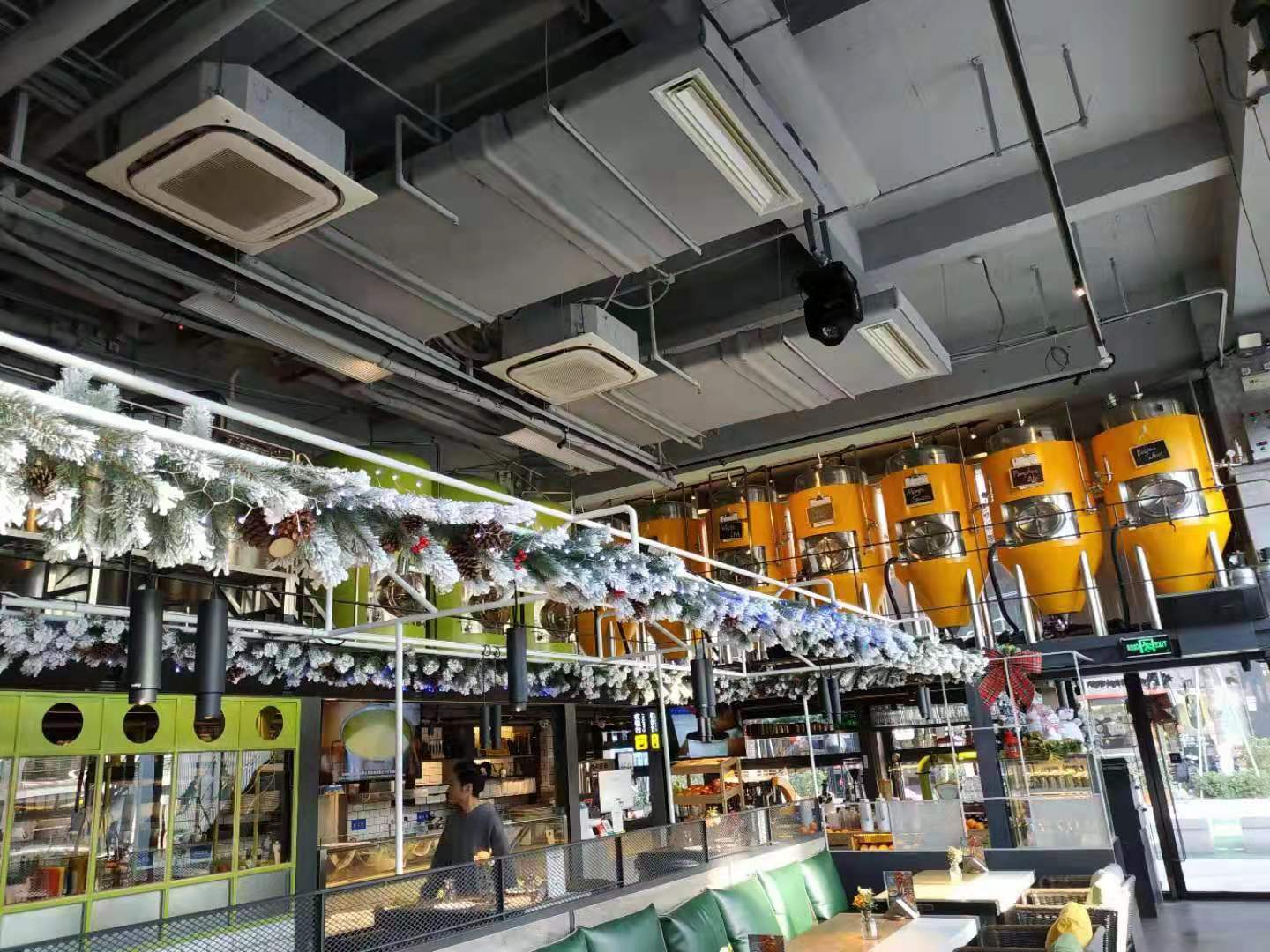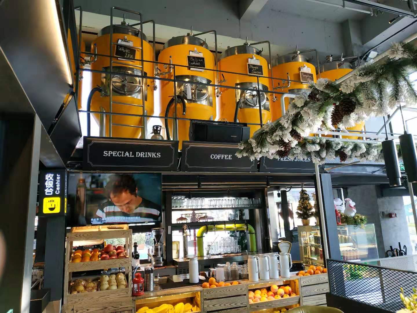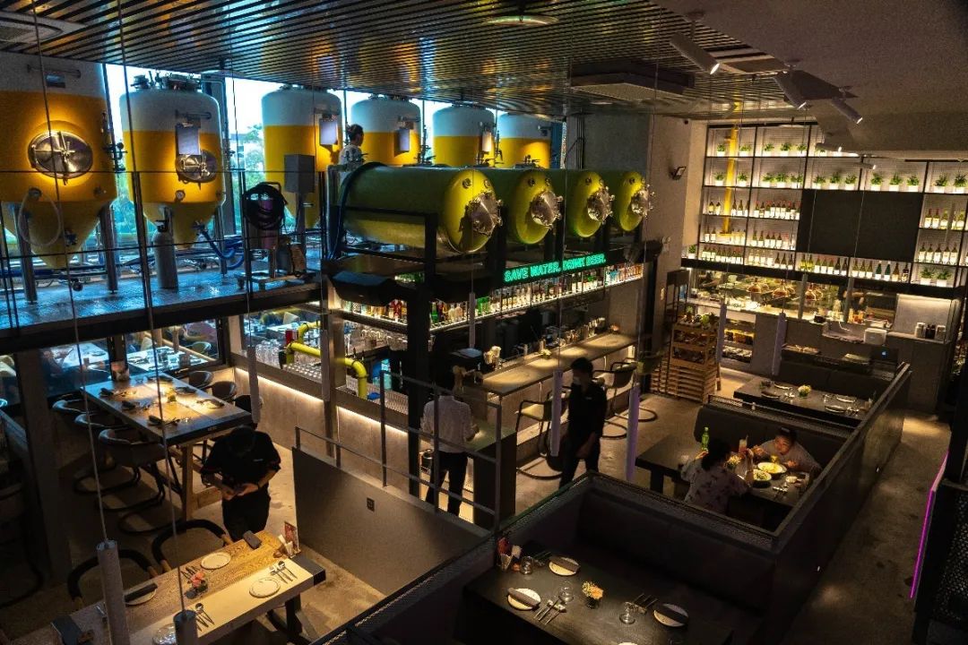 巨型室外空間,聚會(huì)派對(duì)全都可以安排,潮人超級(jí)愛(ài)!走進(jìn)店內(nèi),工業(yè)風(fēng)的黑灰金屬框架與灰色主色調(diào)空間,加上點(diǎn)綴其中的霓虹裝飾,挑高層依次擺列整齊的亮黃色釀酒桶點(diǎn)亮了整個(gè)空間,成為店內(nèi)最搶風(fēng)頭的“明星”。