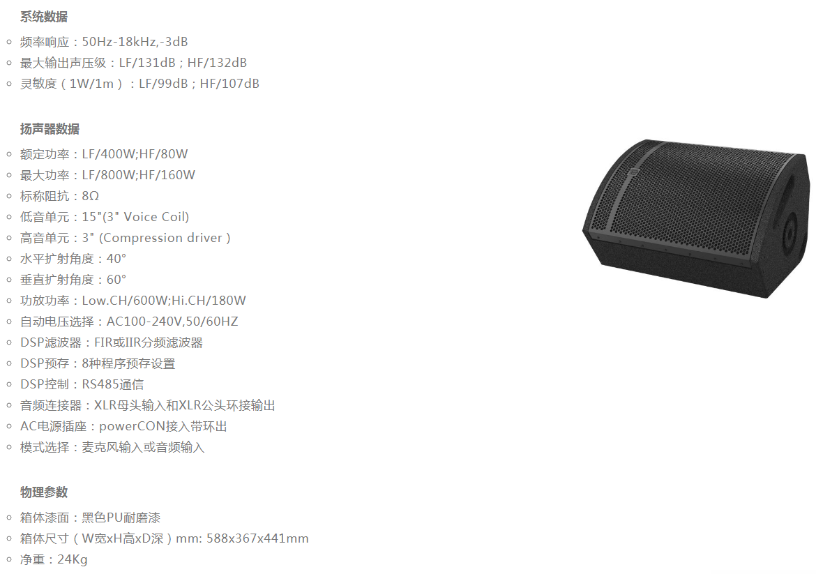 ●產(chǎn)品M600P是15英寸同軸式二分頻全頻音箱,內(nèi)置2通道功放,低音通道600W,高音通道180W。