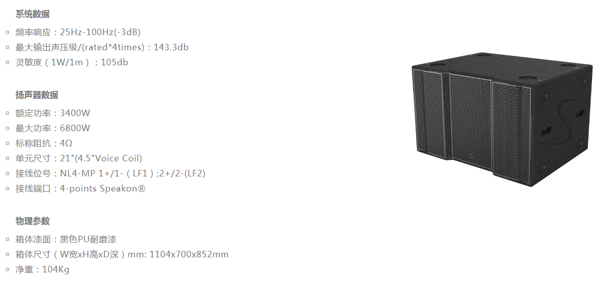 ●產(chǎn)品 RS221是反射式的超重低音揚(yáng)聲系統(tǒng),設(shè)計(jì)的概念堅(jiān)持最高級(jí)的聲音標(biāo)準(zhǔn),特性杰出的暫態(tài)響應(yīng)和優(yōu)良的低頻動(dòng)態(tài)響應(yīng),保證一個(gè)真實(shí)強(qiáng)而有力的低音再生,內(nèi)部采用意大利進(jìn)口B&C單元,確保質(zhì)量穩(wěn)定度,符合各種質(zhì)量的測(cè)試,可操作頻率在25Hz至100Hz,箱體里面有一個(gè)21英寸的長(zhǎng)沖程/4.5英寸(116毫米)音圈加上防水紙盤(pán)及三圈折環(huán)的驅(qū)動(dòng)單元,每只驅(qū)動(dòng)單元可以達(dá)到3400瓦的額定功率,磁鐵結(jié)構(gòu)和雙彈波的設(shè)計(jì)可以滿足最大的直線沖程。