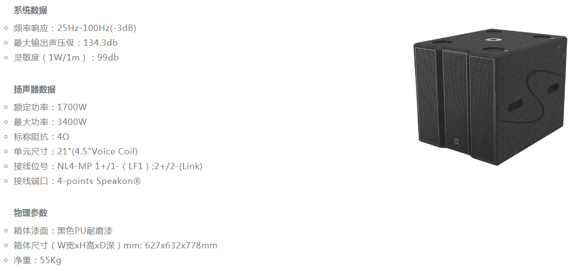 ●產(chǎn)品 RS121是反射式的超重低音揚(yáng)聲系統(tǒng),設(shè)計(jì)的概念堅(jiān)持最高級的聲音標(biāo)準(zhǔn),特性杰出的暫態(tài)響應(yīng)和優(yōu)良的低頻動(dòng)態(tài)響應(yīng),保證一個(gè)真實(shí)強(qiáng)而有力的低音再生,內(nèi)部采用意大利進(jìn)口B&C單元,確保質(zhì)量穩(wěn)定度,符合各種質(zhì)量的測試,可操作頻率在25Hz至100Hz,箱體里面有一支21英寸的長沖程/4.5英寸(116毫米)音圈加上防水紙盤及三圈折環(huán)的驅(qū)動(dòng)單元,每只驅(qū)動(dòng)單元可以達(dá)到1700瓦的額定功率,磁鐵結(jié)構(gòu)和雙彈波的設(shè)計(jì)可以滿足最大的直線沖程,21英寸單元的設(shè)計(jì)提供最大輸出的同時(shí)可以盡可能的減少功率壓縮和失真。