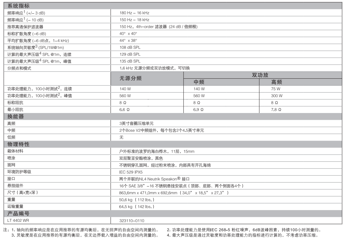 ? Bose V2 中頻組件整合兩個4.5寸延伸頻率范圍的單元,具有更小的失真 和改進的頻率響應(yīng)。與普通 8寸或 12寸單元相比,能提供更平滑、更自 然的語言擴聲表現(xiàn)。 LT 4402 WR 揚聲器配有兩個 Bose V2 中頻組件。