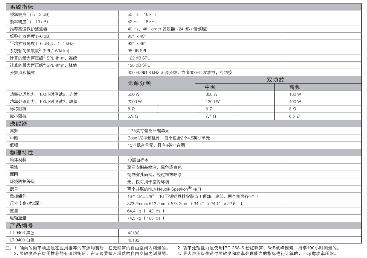Bose  LT 9403 是一款全頻、三分頻揚聲器,設計可作為小型場所的主擴聲 揚聲器,或與其他 LT揚聲器組成群組,形成連貫的聲音覆蓋面,在中、大 型場所中固定安裝使用。與多揚聲器組成的線性列陣相比,大型導波管所 形成的90.x  40。擴散角度,能為大多數(shù)應用場所提供更物有所值的揚聲器 系統(tǒng)方案,表現(xiàn)出精確的聲音覆蓋和較高語言清晰度。