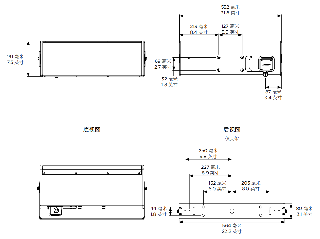 ●隨附的不銹鋼 U 型支架讓安裝輕松方便;箱體后面板還包括 M8 螺紋插件,可接受第三方安裝支架配件。