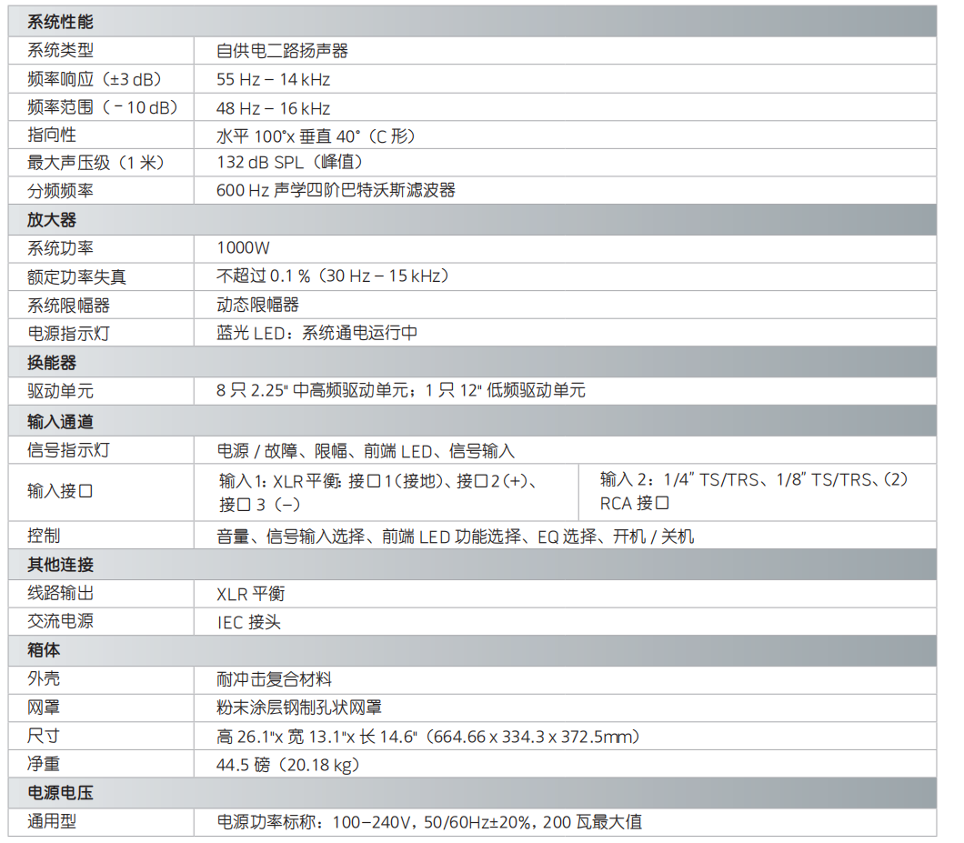 ? 垂直排列的八單元中 / 高頻陣列,各個(gè)單元安裝在定制的 100 度 水平波導(dǎo)管上,提供寬廣而又持續(xù)的聲場(chǎng)覆蓋。
