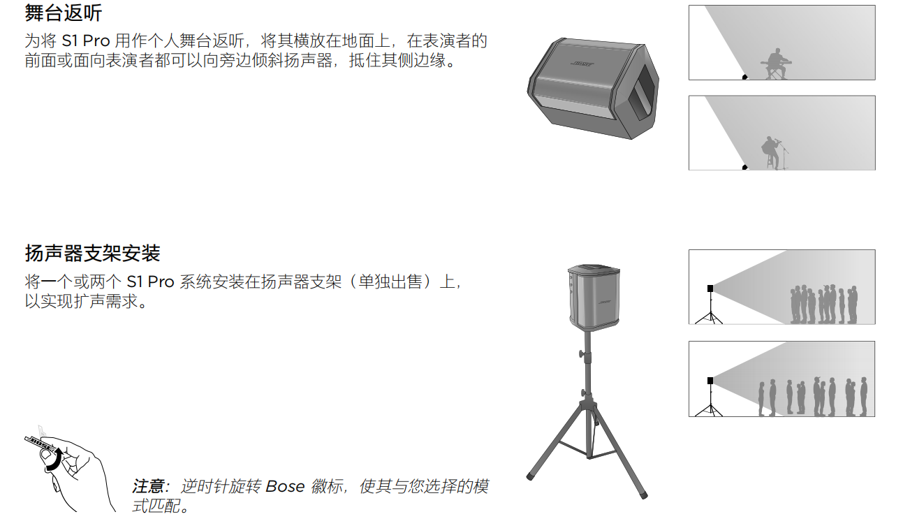 多功能 Bose? S1 Pro 多功能音樂系統(tǒng)有四個獨特的工作模式。通過自動均衡,系統(tǒng)會自動更新,從而保持每種覆蓋模 式的最佳音調(diào)平衡。使用以下示例快速識別最適合您的應用環(huán)境的模式。