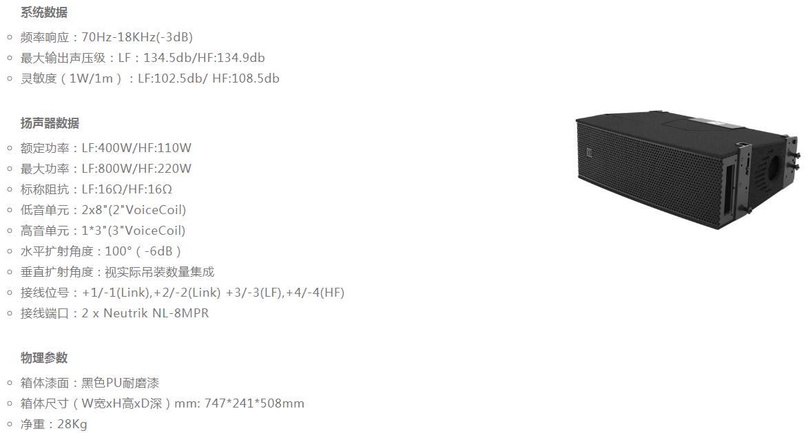 ● 高音采用3寸金屬振膜,90°H/7.5°V傳導指向,線性的高頻平面波發(fā)聲器,高頻遠程投射能強、具穿透力,配合高效能雙8寸中低音單元,具有極佳的遠程投射力度和傳真度,將深深的打動著你。
