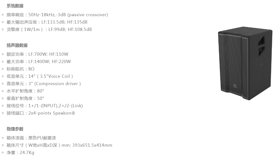 ●RX14 為高性能二分頻同軸揚(yáng)聲系統(tǒng),內(nèi)部采用意大利進(jìn)口B&C高音單元,確保質(zhì)量穩(wěn)定度,符合各種質(zhì)量測(cè)試??刹僮黝l率在18kHz,高音采用單個(gè)3英寸金屬振膜,80°x 50°分散指向性,高頻遠(yuǎn)程投射能強(qiáng)、穿透力強(qiáng),配合高效能單個(gè)14英寸中低音單元,具有卓越的遠(yuǎn)程投射力度和傳真度。