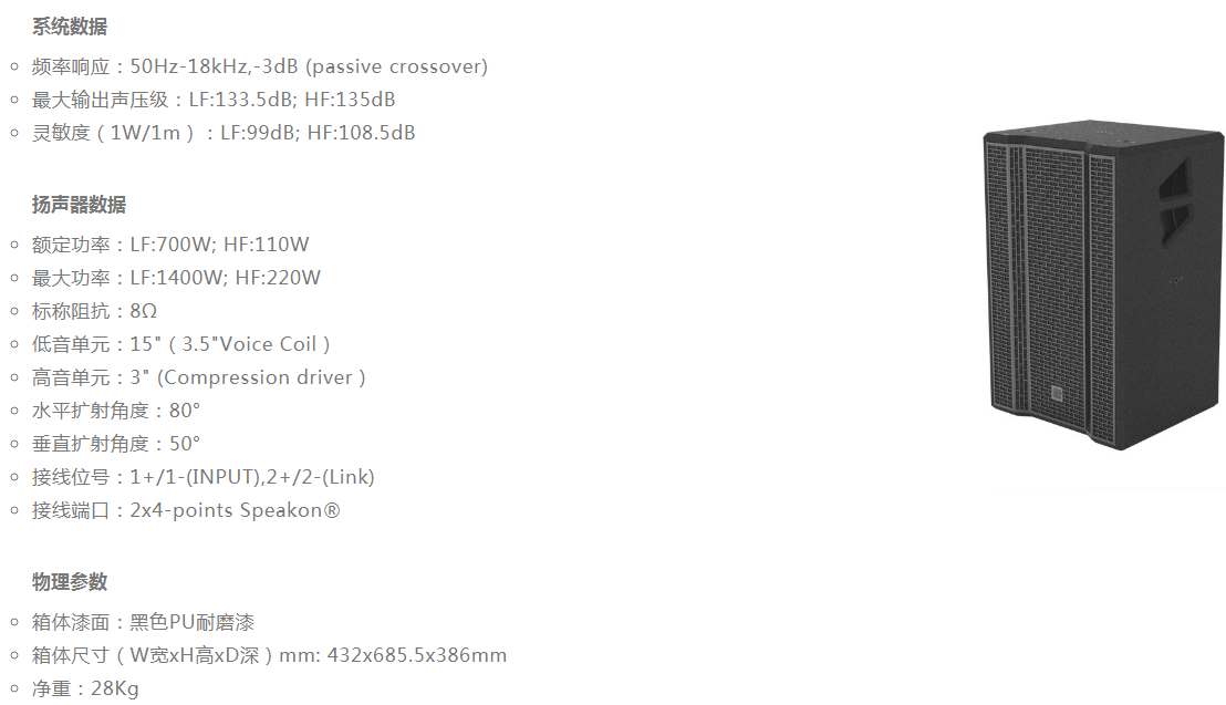 ●產(chǎn)品RX15為二分頻揚聲系統(tǒng),便利的內(nèi)置分頻器。內(nèi)部采用意大利進口B&C高音單元,確保質(zhì)量穩(wěn)定度,符合各種質(zhì)量測試??刹僮黝l率在18kHz,高音采用3英寸金屬振膜,80度x50度指向性,高頻遠程投射能強、穿透力強,配合高效能單個15英寸中低音單元,具有極佳的遠程投射力度和傳真度。